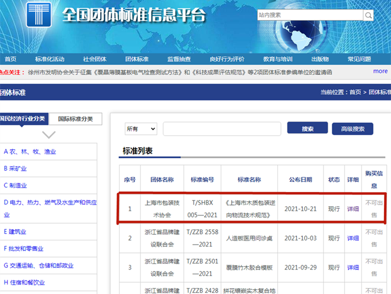 今天,全國團體標準信息平臺發布了編號為T/SGBX005-2021的“上海市木質包裝逆向物流技術規范”,這標志著由上海樹人包裝科技有限公司會同母公司樹人木業共同牽頭制訂的這項團標得以正式發布實施。